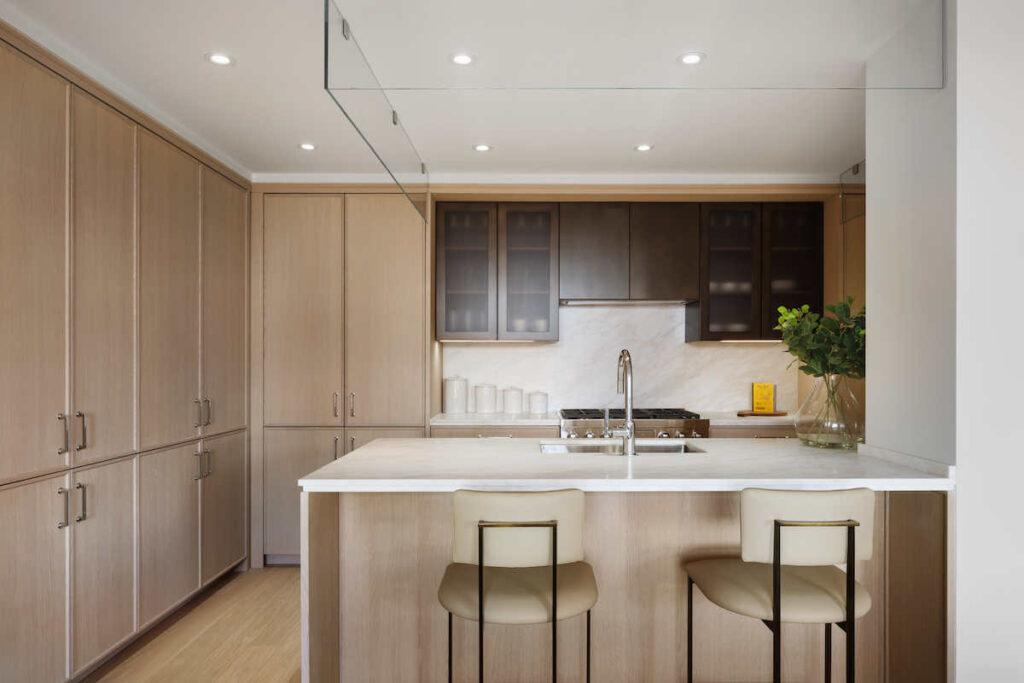 柔らかな自然光が満ちるリビングルームは、ホワイトオークのフローリングが温かみを添え、明るく心地よい雰囲気を醸し出しています。キッチンはボッフィ社製の特注で、ナミビアローズ大理石のカウンター、ホワイトオークのキャビネット、プロ仕様の家電が備わっています。