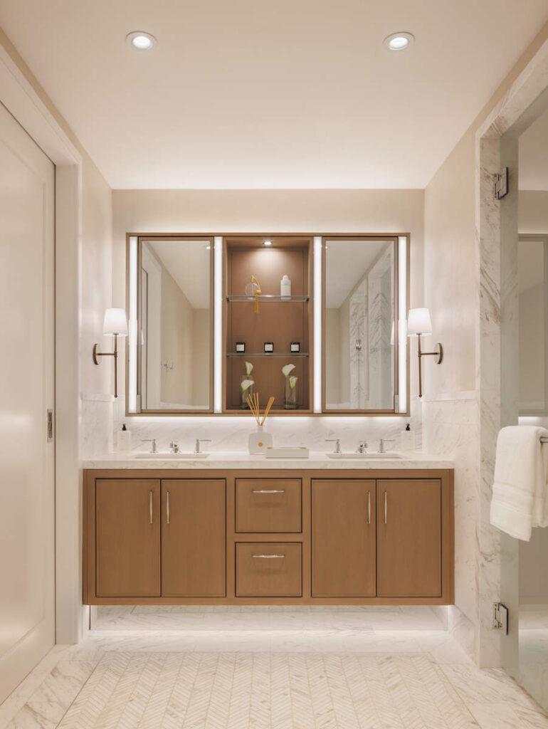 メインバスルームは、大理石のカウンター、光沢のあるクローム仕上げの水栓、特注の洗面台、広々としたシンクを備え、ホテルのスイートのような上質感をたたえています。メインベッドルームには大型クローゼットが2つあります。
