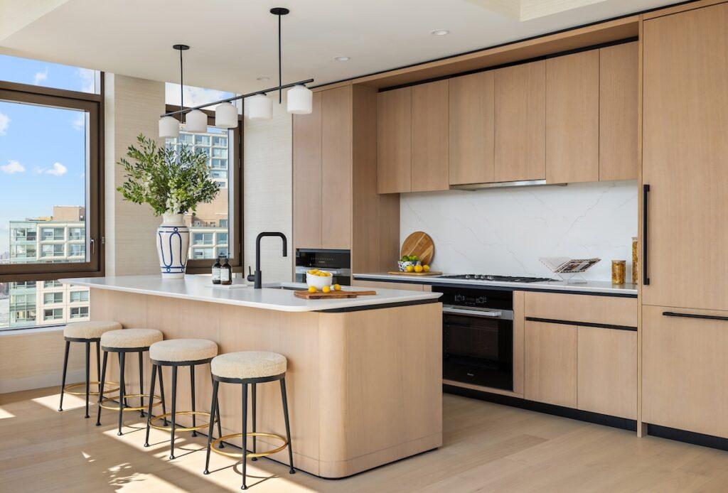 キッチンには、カラカッタゴールドクォーツのカウンタートップとバックスプラッシュ、特注キャビネット、InSinkerator ディスポーザー、ワインセラー、ミーレ製家電を採用。オーガニックな色調と柔らかな曲線を取り入れた、モダンで上質なデザインに仕上げられています。