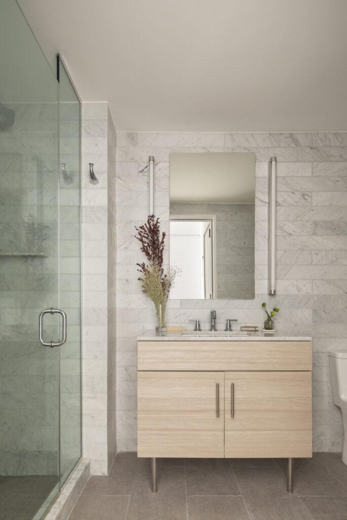 バスルームには大理石仕上げの壁と洗面台、ガラス張りのウォークインシャワーを設置。住戸内にはボッシュ製のスタック式洗濯乾燥機も備えられています。