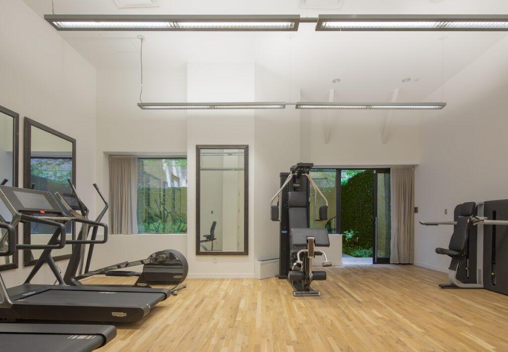 室内には、ホワイトオーク材のフローリングが敷かれ、大型の窓やガラスドアが採用されています。キッチンはオープンレイアウトで、リビングと一体的に使える構成です。特注キャビネット、クォーツカウンタートップ、大理石のバックスプラッシュを組み合わせ、アイランドカウンターを中心としたシンプルなデザインとなっています。家電はボッシュ製で、ウォールオーブン、4口ガスコンロ、パネル仕様の冷蔵庫と食器洗い機が組み込まれています。
